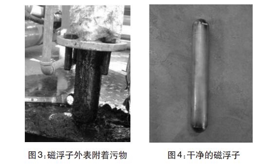 經(jīng)過兩年多運行,污水罐內可能沉淀污泥雜質導致液位計示數(shù)不準。現(xiàn)場拆卸液位計,并且對浮球和磁浮子進行清洗。(圖3-圖4)